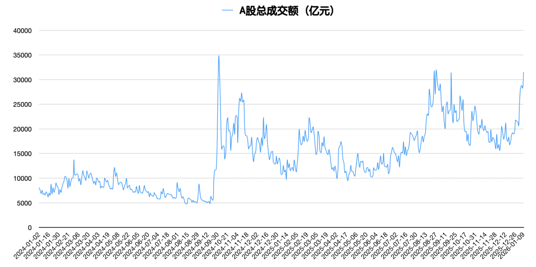新年第一周,量能上升之快之猛远超我个人预期。没想到三万亿这么快、如此容易就到了。而市场氛围距人声鼎沸似乎还有一段距离,那么今年春季行情后续的时间里日成交额很可能再上一个新的高度。