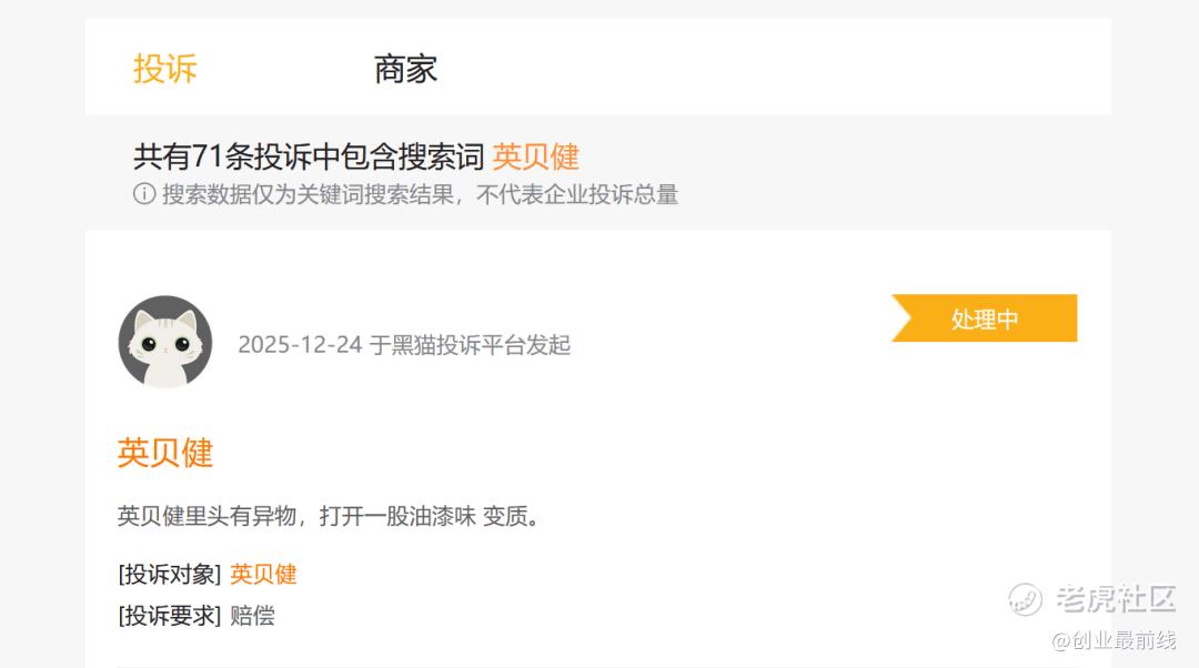 值得一提的是,在黑猫投诉上,搜索关键词“英贝健”,有71条投诉结果,部分涉及异物及饮用后胃部不适。