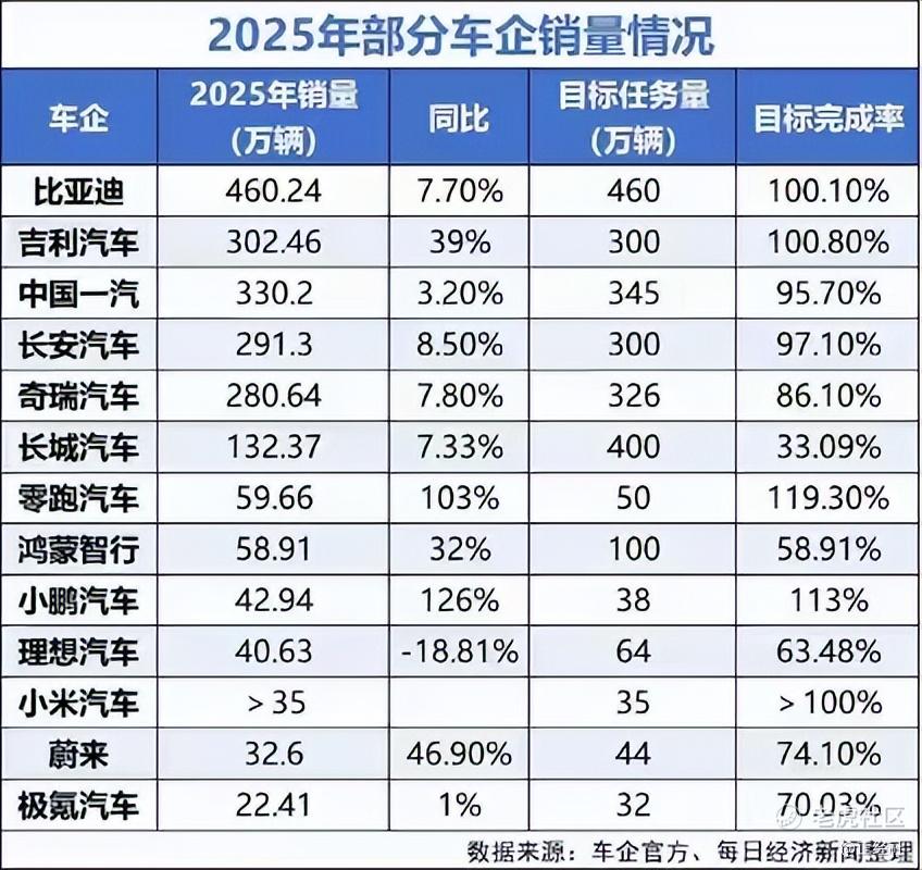 公开资料显示,2025年,长城汽车以132.37万辆的销量仅完成400万辆目标任务的33.09%,成为榜单中目标完成率最低的企业。