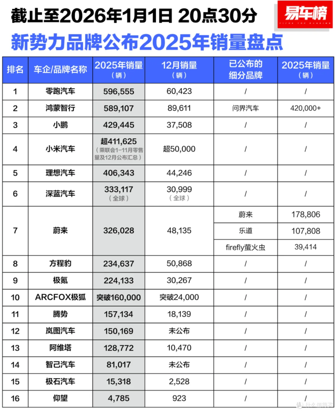数据显示,2025年全年,排名前三的新造车品牌分为零跑、鸿蒙智行和小鹏,其销量依次为59.66万辆、58.91万辆和42.94万辆,同比分别增长103%、32%和126%。