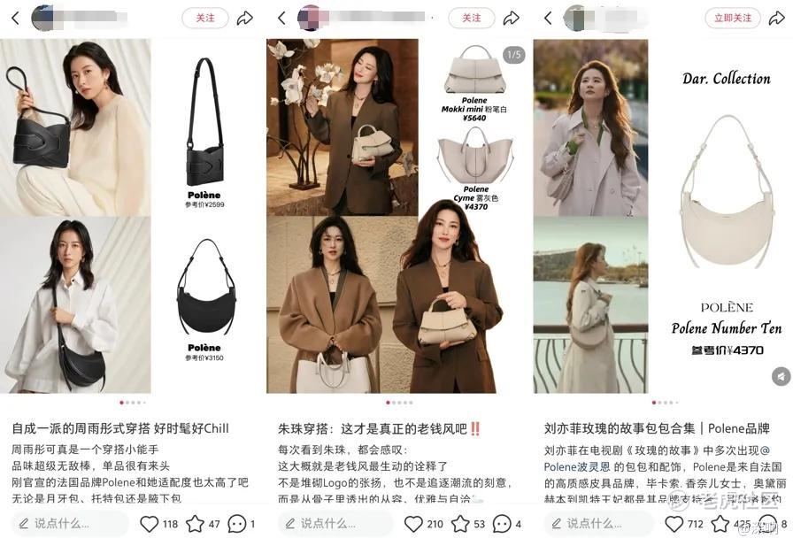 Polène就先后绑定周雨彤、刘亦菲、朱珠等当红明星,在其热播剧集中植入产品,继而借社交媒体发酵、扩散,打造明星同款。比如刘亦菲的《玫瑰的故事》热播时,剧中同款包包走红各大社交平台。Coach也加大在小红书、抖音等平台的投放力度,小红书#COACH包 相关话题浏览量持续上升。