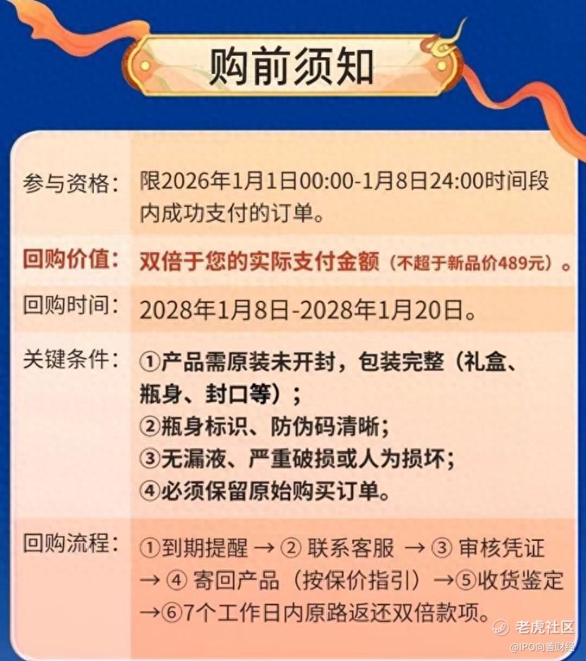 玩法规则并不复杂,简单来说,在规定的时间内,消费者限量购买489元的“花神令”(225ml*2瓶),在不开封的前提下,如果两年后“完璧归赵”,就能得到两倍收益。