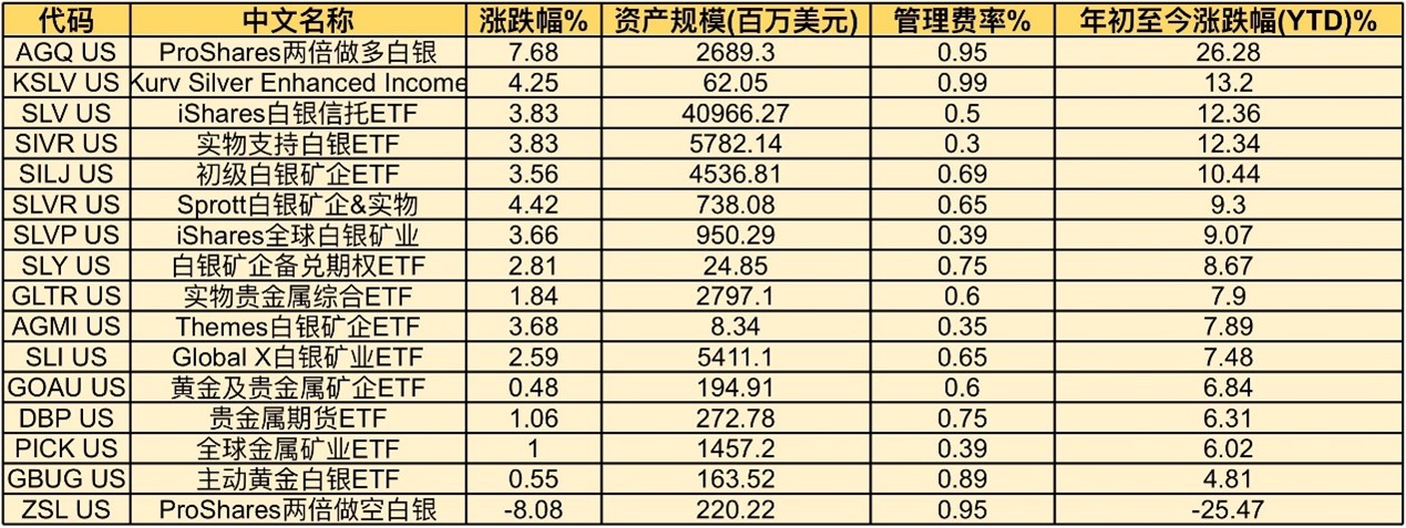 在策略型产品方面, $2倍做多白银ETF-ProShares(AGQ)$ 作为杠杆做多白银ETF,通过金融衍生工具实现对白银日度涨跌幅的倍数放大。这类产品在趋势明确且波动方向单一时,具备较强的收益放大能力,如在暴涨阶段,其收益为未上杠杆的etf两倍之多,但其风险也明显高于实物型ETF。