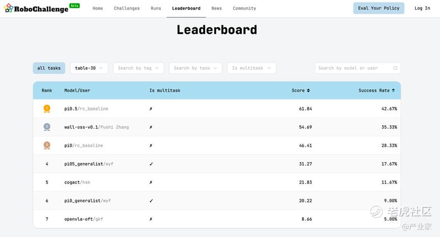 因此,相较于闭源模型“黑盒黑箱式”的打榜方式,用公开代码的开源具身智能模型参与测评,才是最货真价实,也是最能反应真实模型水平的评测方式。