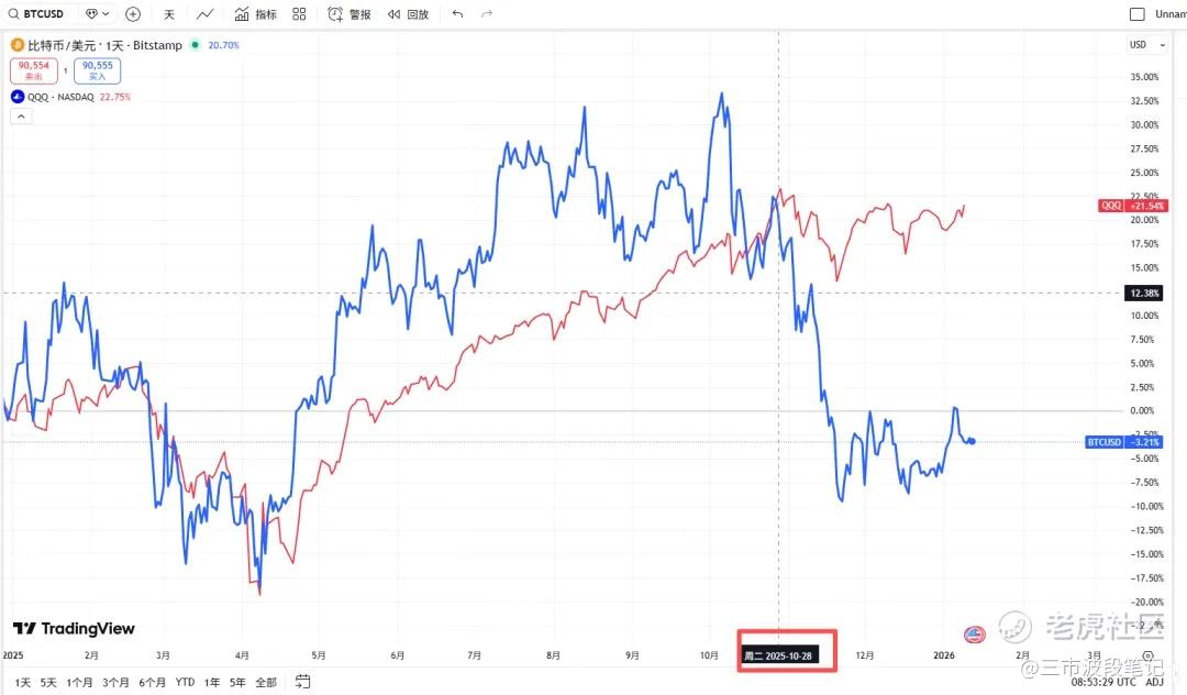这是我拉的QQQ和BTC的走势对比图。可以明显的看出,在2025年11月前,QQQ和BTC呈现明显正相关。