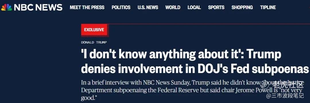 特朗普否认参与司法部对美联储发出传票行动,自称“对此一无所知”。
