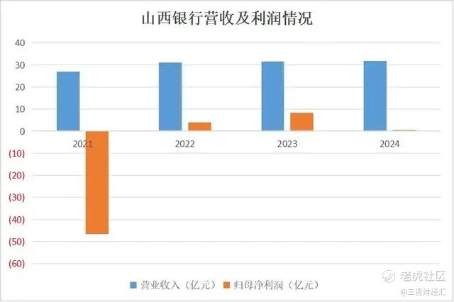 从财务数据来看,2021年至2024年,山西银行营业收入保持稳定增长,分别为27.05亿元、30.96亿元、31.49亿元、31.68亿元。
