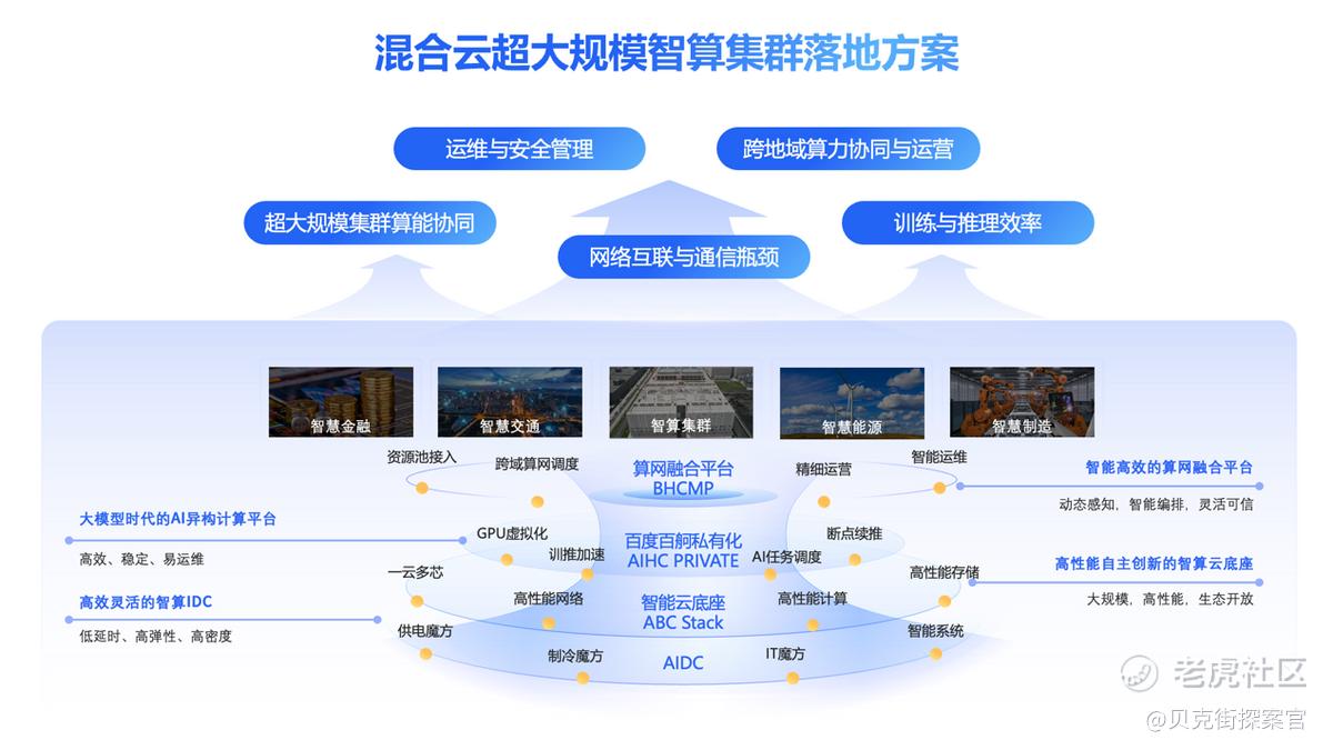 在此基础上,百度智能云将上述能力通过混合云形态进行交付与部署,既满足企业对算力弹性与规模扩展的需求,又兼顾数据安全、系统稳定与算力可控等行业核心诉求。围绕混合云AI基础设施建设,百度智能云进一步构建起覆盖算力基础设施、云平台、AI训推平台与算力运营的全栈体系,并在超万卡级智算集群中完成规模化验证。