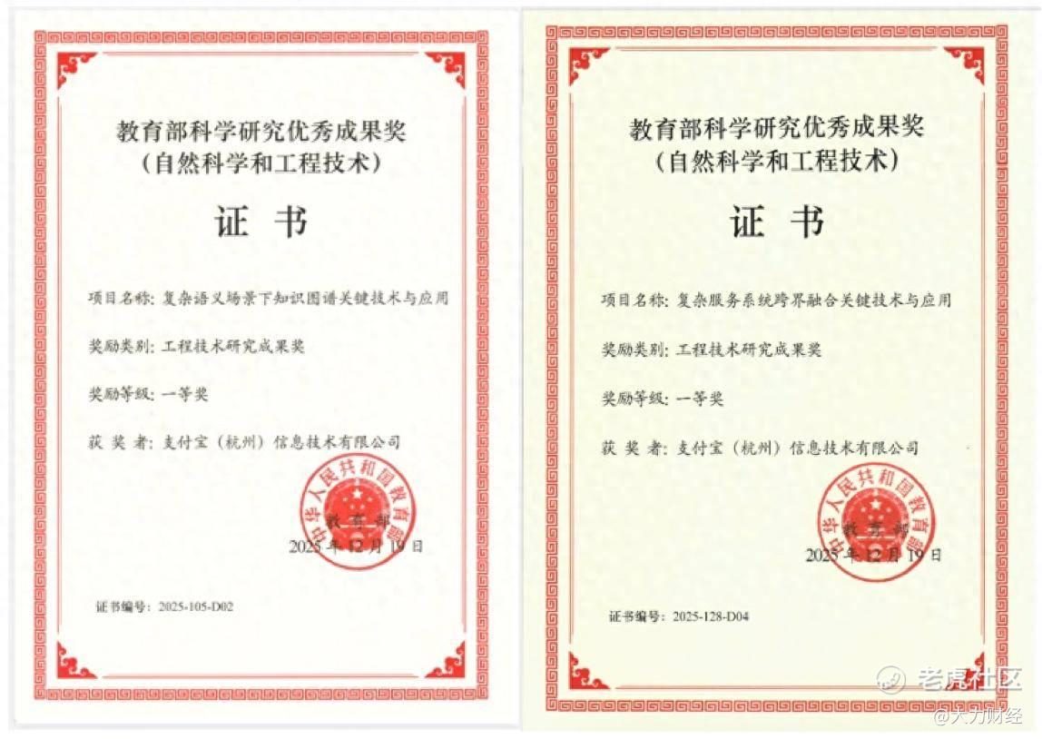 近日,教育部公布了2025年科学研究优秀成果奖(自然科学和工程技术)授奖名单。蚂蚁集团旗下支付宝(杭州)信息技术有限公司作为主要完成单位参与的“复杂语义场景下知识图谱关键技术与应用”与“复杂服务系统跨界融合关键技术与应用”两项成果,分别荣获工程技术研究成果奖一等奖。
