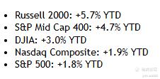结合2026年的表现来看,典型的一月效应正在显现:罗素2000目前已上涨5.7%,道指已上涨3%。纳指、标普500紧跟其后,也录得近2%的涨幅。