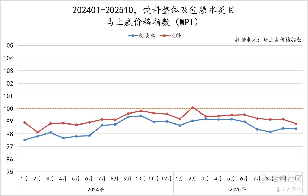 这一趋势得到马上赢数据的明确印证:2024年1月至2025年10月,包装水WPI指数始终低于100,意味着价格同比持续走低,且下行压力远超整体饮料类目;尤其是2025年6—9月的行业旺季,WPI指数加速下滑,清晰折射出各大厂商为抢占市场份额,纷纷采取“以价换量”策略的激烈竞争态势。