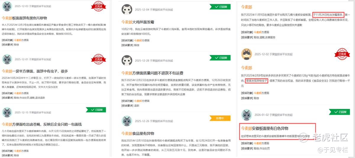 其三,品控问题影响消费者复购。在黑猫投诉平台上,关于今麦郎产品质量的投诉屡见不鲜,涉及问题包括安徽板面吃出霉变面条、白色异物,一袋半方便面面饼中发现虫子,火鸡拌面出现发霉变质等情况。