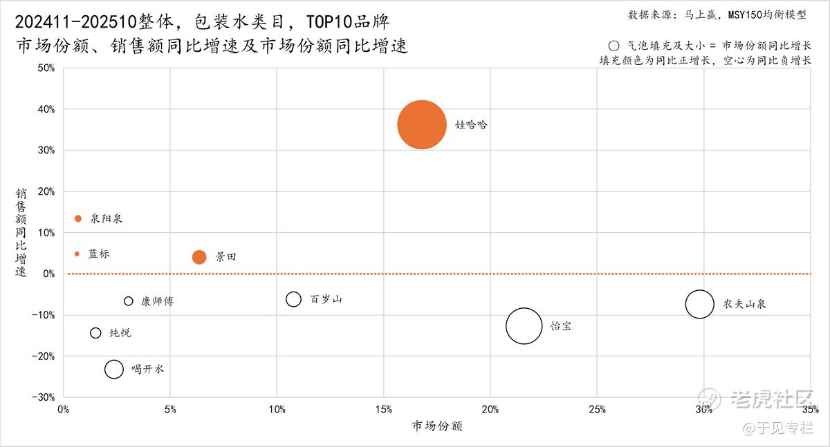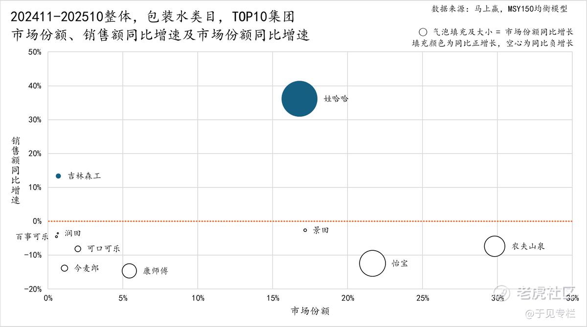 更严峻的数据还在后面:2024年11月至2025年10月,包装水TOP10集团中仅娃哈哈、吉林森工实现正增长,今麦郎销售额同比跌幅达10%—20%;值得注意的是,作为熟水代表品牌之一的喝开水,同期销售额同比增速也下滑超20%,下行态势颇为严峻。