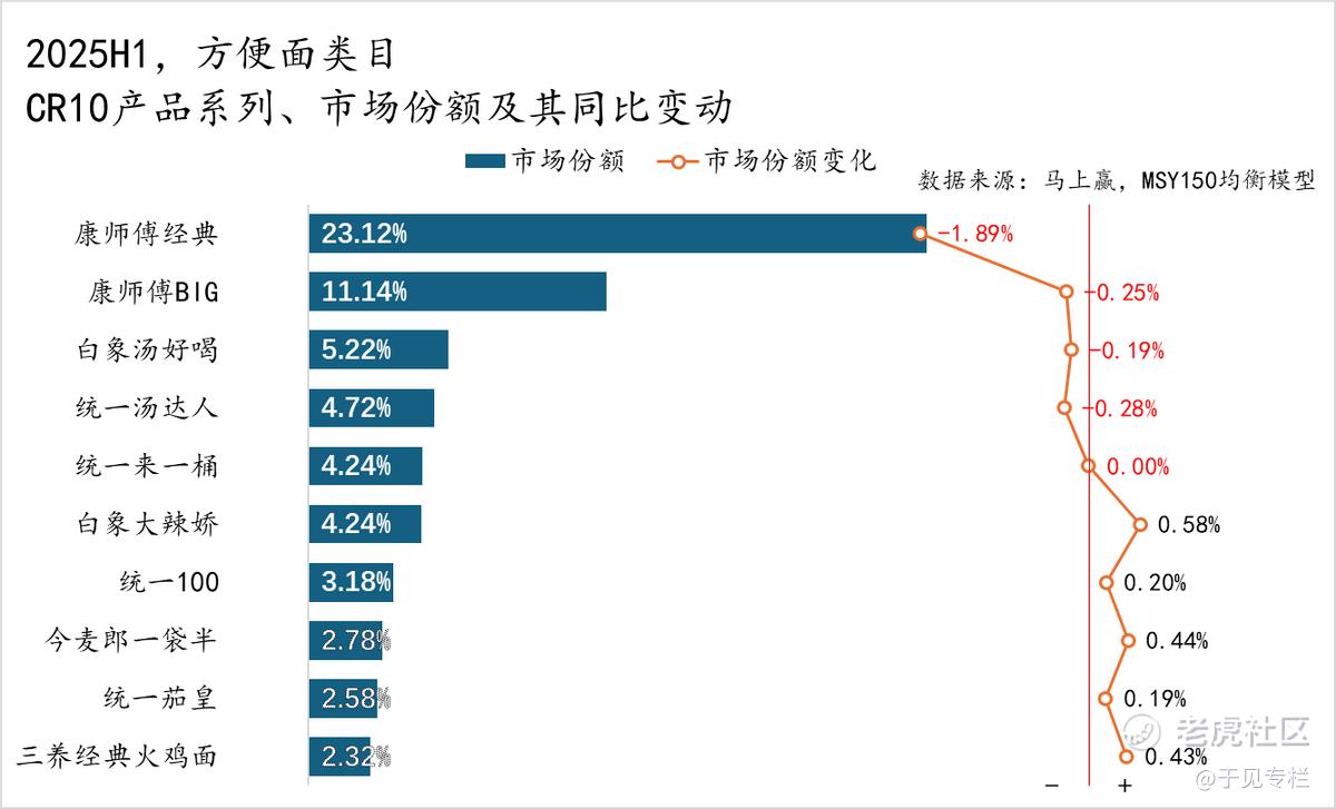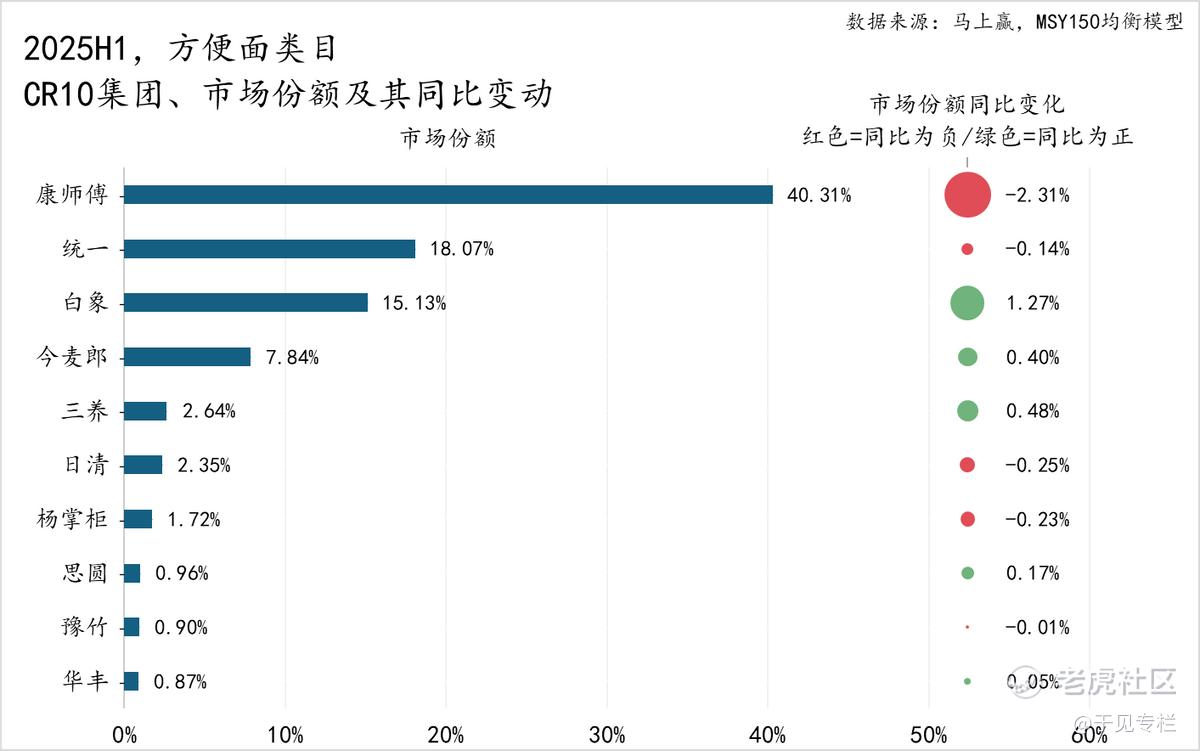 在行业大盘持续下行的背景下,2025年上半年今麦郎方便面的市场份额仅为7.84%,不仅被白象(15.13%)大幅赶超,更与行业龙头康师傅(40.31%)拉开巨大差距。