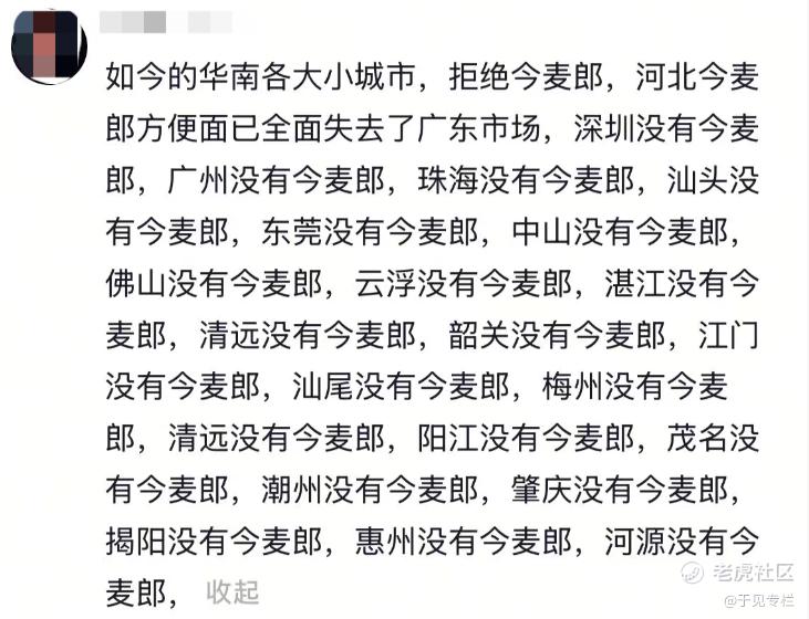 无独有偶,社交媒体平台上也有类似的市场反馈。有网友表示,今麦郎方便面已全面退出广东市场,深圳、广州等核心城市的各类终端渠道中,均无该品牌产品在售。