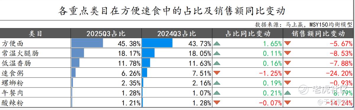 如杜磊所言,2025年阿里、京东、美团三大平台掀起的外卖混战,进一步加剧了速食品类的市场压力。马上赢数据显示,速食品类中仅有午餐肉实现市场占比与销售额双增长,其余品类均出现不同程度下滑,其中方便面品类的跌幅为5.67%。