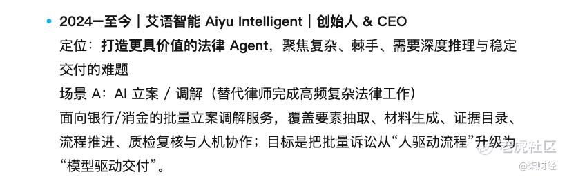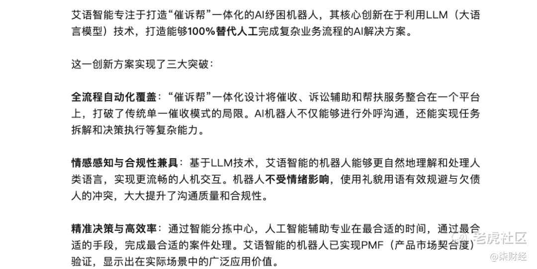 根据官方公布的数据,截至目前,“艾语已与60余家金融机构签约,月度立案量稳定过万件,服务能力显著超越传统律所”,业务流程是“针对传统律所难以覆盖的低客单价、大体量案件,艾语以AI实现线上立案、进度跟踪、分期方案制定与执行跟进,并按实际回款计费”。