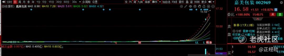 其次是 $嘉美包装(002969)$ ,复牌后股价一字涨停,报16.58元/股;停牌前更是在13个交易日内大涨超230%。
