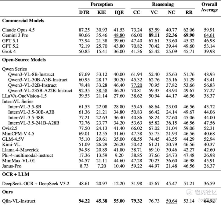 通过对23个主流多模态模型的全面评测,FCMBench展现出了专业的鉴别能力。在FCMBench的首轮评测中,谷歌的Gemini 3 Pro(64.61)位列商业模型榜首,阿里云Qwen3-VL-235B(57.27)成为最佳的开源基模。基于奇富实际业务场景研发的信贷垂类多模态大模型,Qfin-VL-Instruct以64.92的F1分数斩获综合第一。