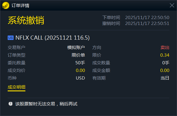 按照倒叙来说,上一次出现的问题应该是模拟账户。前一阵我的模拟账户里有两个已经过期好多天的期权,按说早应该到期作废并从我的持仓中消失,但是它们还在。我也没法平仓,因为已经过了最后交易时间,最后是联系老虎客服从后台直接从我的账户里把这两个期权删除掉了。说到模拟账户,我遇到的问题其实相当多。在2025年11月17日,奈飞1拆10。开盘之后模拟盘无法交易期权,我一下单就被系统撤单,显示“该股票暂时无法交易”,但是同一时间实盘可以正常交易。我当时顾不上处理模拟盘的问题,只能先做实盘交易。事后我联系老虎客服按照我当时挂单的价格以成交来计算,这才使那些期权出现在了我的持仓里。再往前说就比较早了。当时在2023年,我需要探索一个超高频的交易模式。那个时候模拟盘初始金额还是10万美元,还不能重置。当时别的都挺正常,但是当我交易距到期日很远的一些期权的时候,有些期权怎么也成交不了。我看明明价格可以成交啊,怎么就成交不了。然后我就联系客服,当时给我的解释是,系统是按照上一笔实际成交的价格来判定,如果一个期权没有成交量那模拟盘就无法成交。大概应该是这样,毕竟是2年多以前的事情,可能说的不是100%准确。当时我就说不对啊,你们这个规则不合理啊,根本不符合实际情况。但是经过我反复沟通,客服一口咬定没有问题,暂时也不会做出任何改变,说富途也是这样的规则。我说你们又不是富途,这个东西有问题你们就要改啊,管其它券商干什么。客服甚至都没说给我反映一下,评估看看是不是需要改动,就一直在给我东拉西扯,反正就是说没问题。后来我也没有耐心了,也不想跟它们再较劲了,从那之后模拟盘就比较少做了,很多时候都是直接用实盘来试验,实在是无奈之举。去年在社区还看到有人说模拟盘好用,我说老虎这个模拟盘不好用,我客观地指出了问题。结果对方反唇相讥并且把我拉黑。拉不拉黑我无所谓,这种愚不可及的人我本来也没必要和他多说什么,但问题是老虎社区里特别多这种人。大家观点不一样是可以的,但是当你和他观点不一样的时候,他就突然不会好好说话了,没法进行一个平和的交流,这还是挺让人莫名其妙的。哪天专门发个帖子来吐槽一下这一类老虎用户。