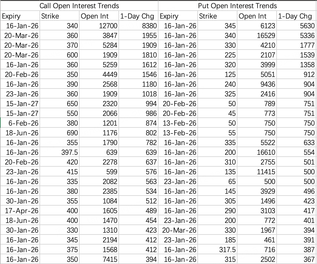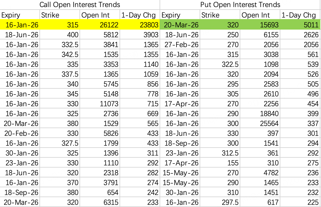 看涨期权开仓买入末日价内call315 $TSM 20260116 315.0 CALL$ ,价内call大家都懂,不太容易上涨。sell put大单是sell put$TSM 20260320 320.0 PUT$ ,上次的sell put大单又追加仓位了。所以总体来看股价会围绕320震荡。