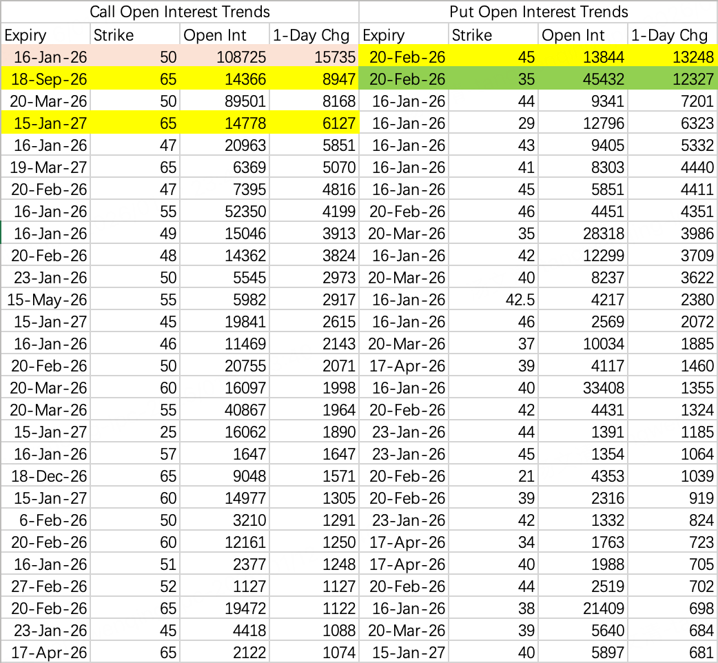 不过就算趋势再好,本周应该很难突破50,因为本周到期50call未平仓有10.8万手。