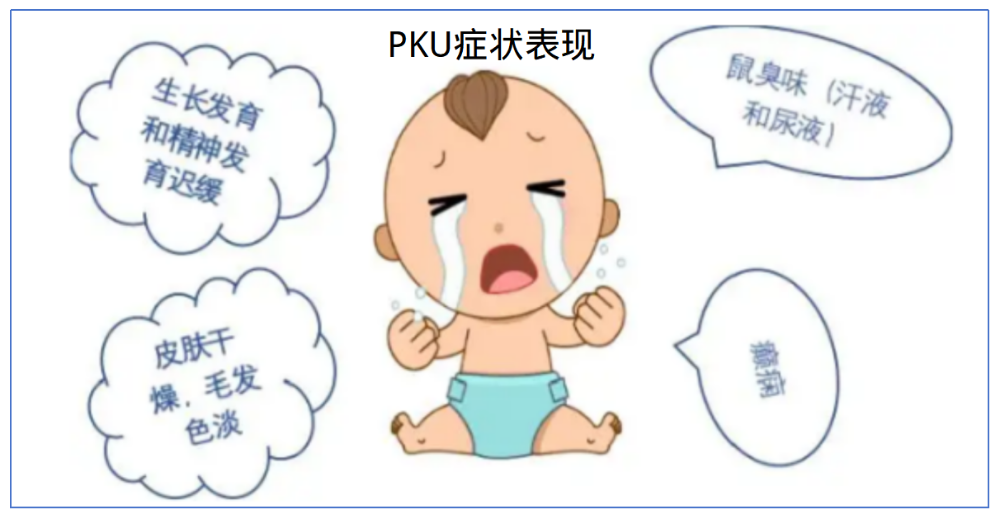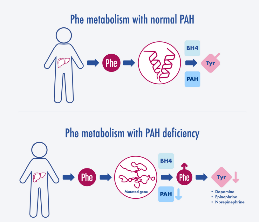 苯丙酮尿症(PKU)是由于PAH基因发生致病变异,导致PAH活性下降或缺乏,苯丙氨酸Phe不能转换为酪氨酸Tyr,使得Tyr及正常代谢产物减少,血Phe浓度增高,最终影响中枢神经系统发育。