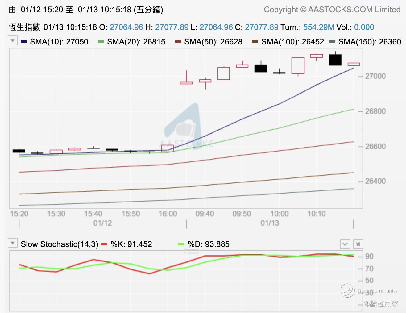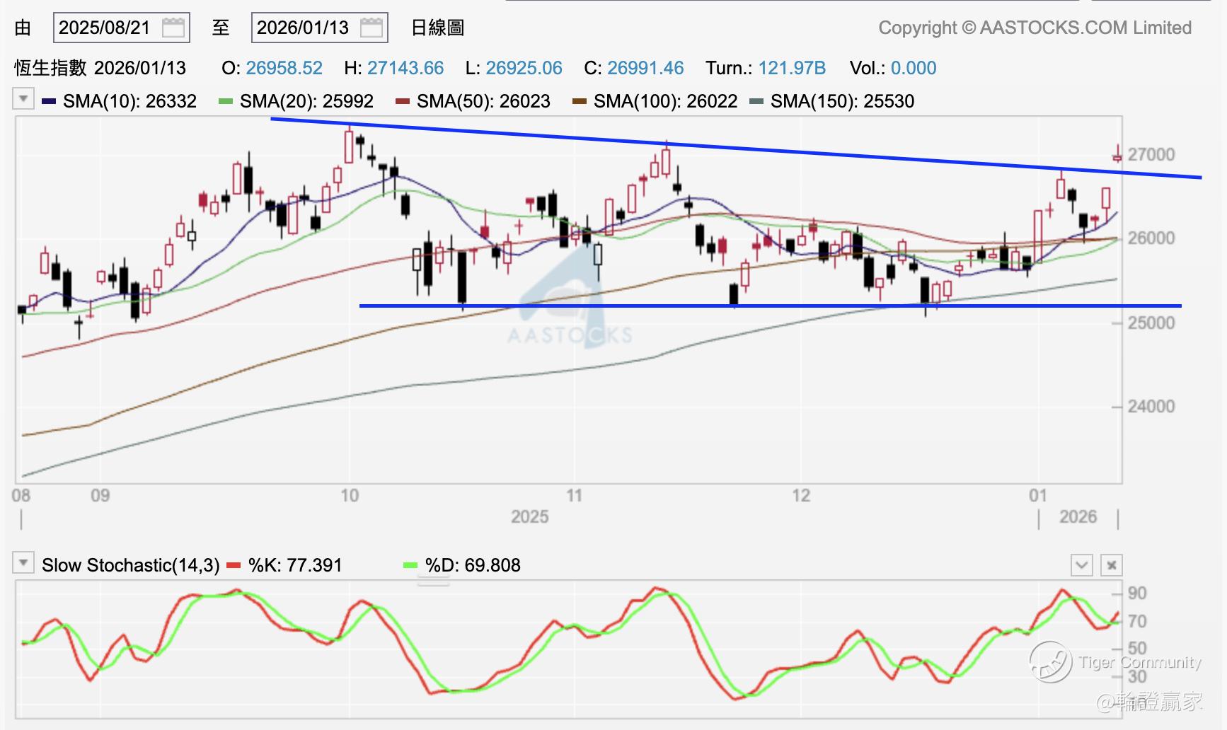 如果你过埋夜嘅话,嘿,呢个1月你都可以提早埋数,事关依家9点13分时已经见到期货上到27000点以上,本来喺日线图画住个「大楔形」,顶线同日线保历加顶线相约,都系268左右。不过照咁睇嚟都应该会破到呢个位。
