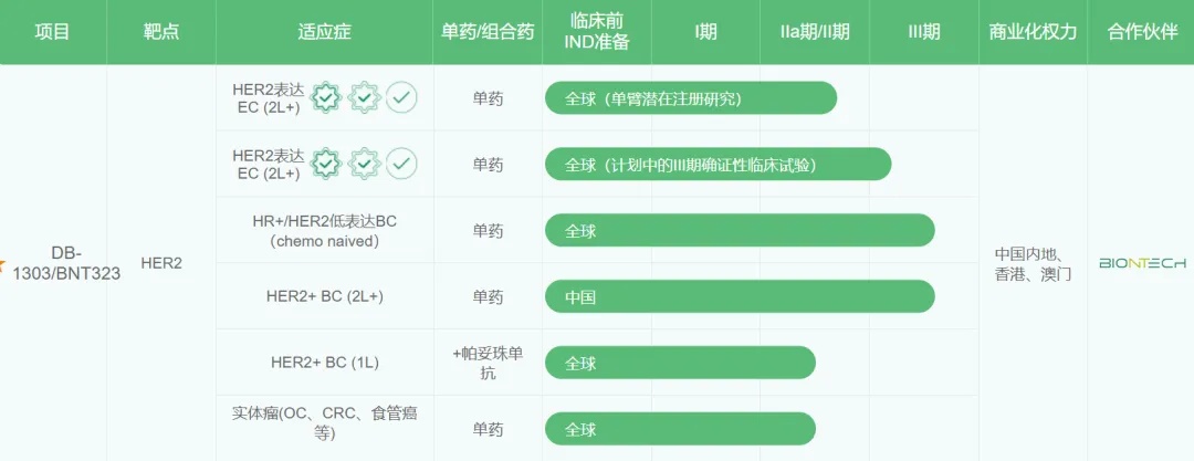 2023年3月,映恩生物与BioNTech达成重磅BD合作,聚焦其核心HER2 ADC产品DB-1303的全球开发与商业化。根据合作协议,映恩生物可获得总计1.7亿美元首付款,以及超15亿美元的里程碑付款和双位数比例的销售提成,为药物研发提供了充足资金保障。尽管DB-1303的临床推进进度并非行业最快,但BioNTech的深度加持,大幅拔高了这款药物的市场预期天花板。