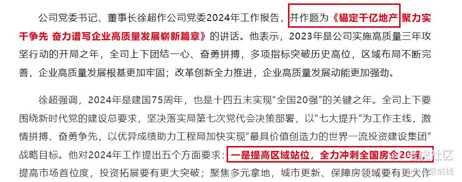 在2024年1月举行的中建壹品党委一届二次全体(扩大)会、一届二次职工代表大会、2024年工作会议上,徐超在讲话标题中就明确了“锚定千亿地产”目标,要求“全力冲刺全国房企20强”。