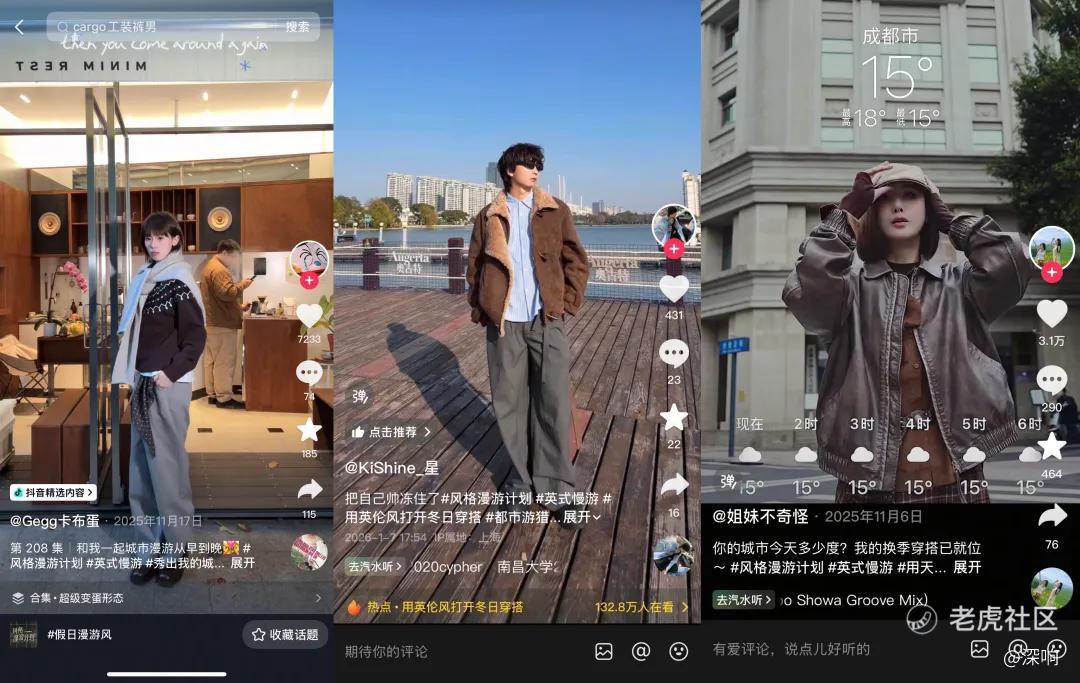 抖音时尚近期推出的「风格漫游计划」正是沿着这个逻辑展开。平台通过 #都市游猎风、#英伦学院风、#假日漫游风 三个话题,全面覆盖到了都市通勤、校园日常和户外出游这三类高度日常、又最容易产生穿搭需求的生活场景。