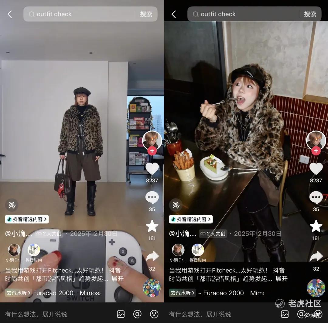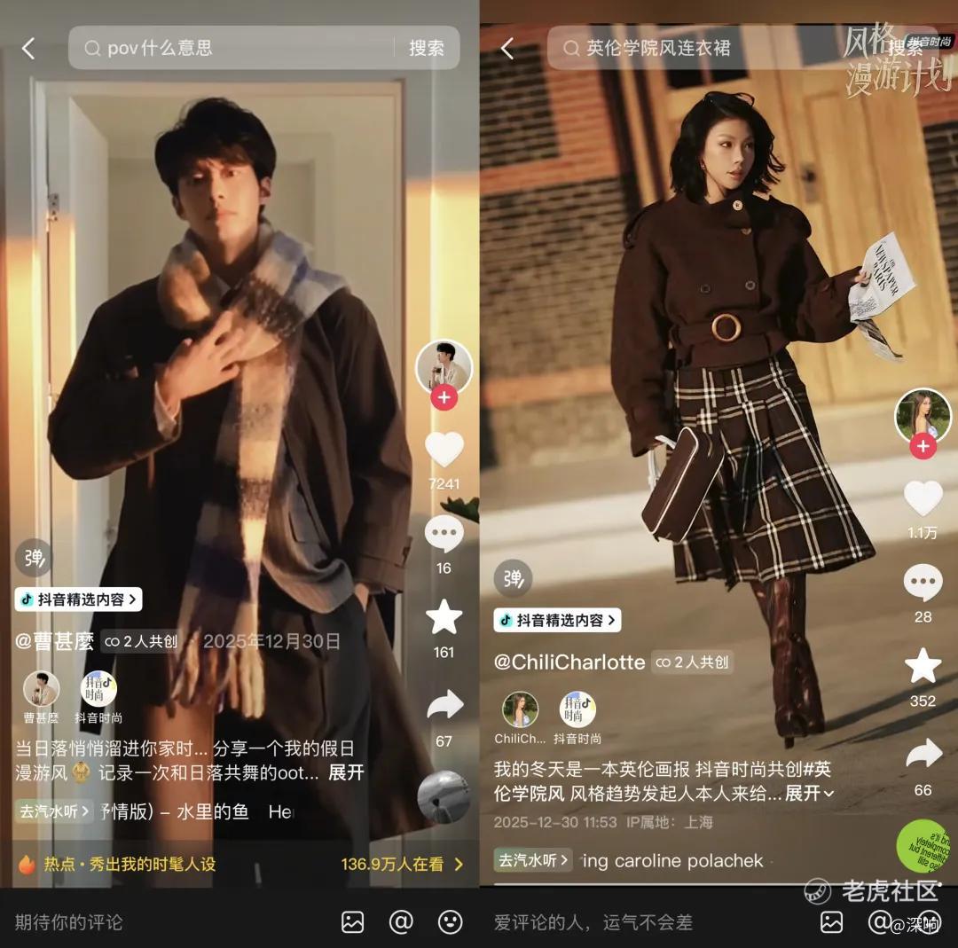 比如抖音创作者@曹甚么 在家里借着流转的日落光影,完成了一场“与日落共舞”的ootd展示,浪漫又随性。看他的视频,你会沉浸其中,感受一个人、一段时光与一身衣服共同完成的一次真诚的自我表达。抖音创作者@ChiliCharlotte,以焦糖色毛呢短外套搭配格纹半身裙、长筒靴以及棕色手提包,在有暖光和复古建筑的户外场景里,营造出了仿佛英伦画报的氛围美感。