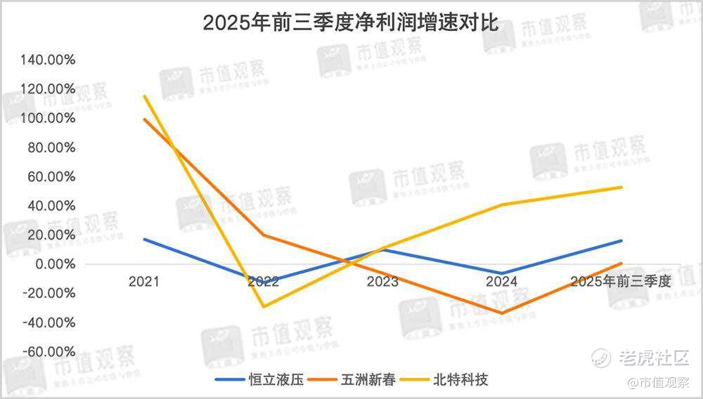 近年来,恒立液压的盈利增长较为稳健,受益于工程机械行业的复苏2022年以来业绩稳步增长。五洲新春和北特科技的增速波动较大,北特科技增速更快。五洲新春自2023年便陷入负增长,2025年前三季度近乎平增,增长动能较为乏力。