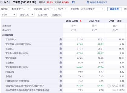 回看2025年前三季度,口子窖营收为31.74亿元,同比下降27.24%;净利润为7.42亿元,同比下降43.39%。单看第三季度,营收下滑幅度扩大至46.23%,净利润更是断崖式下跌92.55%,仅录得2696.51万元。