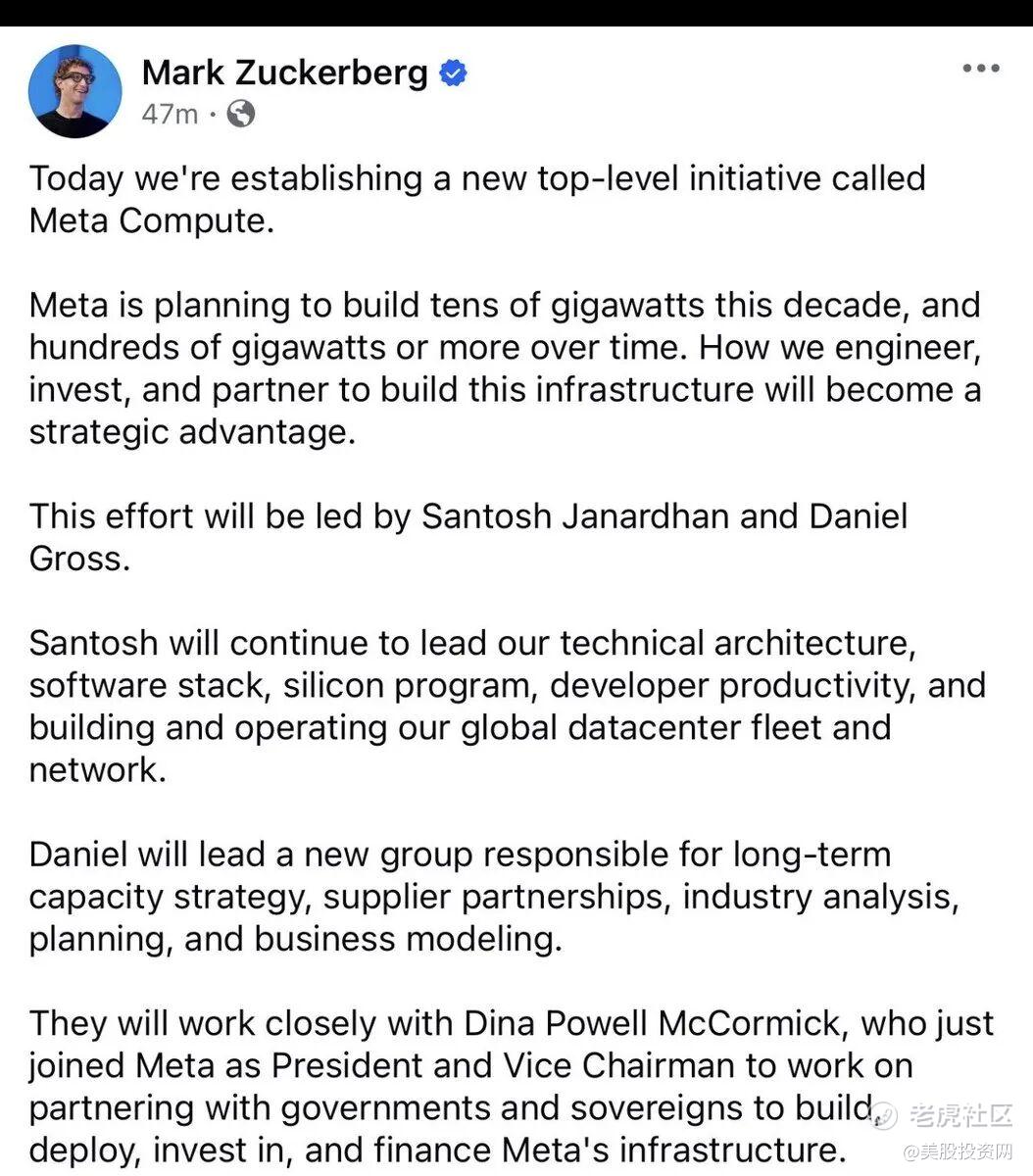 与高管任命同步进行的,是内部组织架构的重大调整。扎克伯格宣布成立名为“Meta Compute”的全新组织,由Santosh Janardhan和Daniel Gross两位核心人物直接向其汇报。