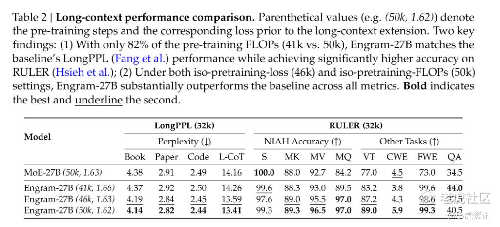 除了通用推理,Engram在长文本(Long Context)领域的表现同样证明了“分工”的价值。