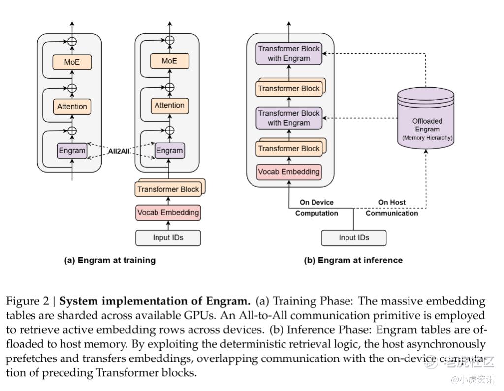 卸载(Offload):我们可以把几百亿、甚至上千亿参数的Engram词表,直接扔到便宜、量大、易扩展的“CPU内存(DRAM)”里,甚至放在NVMe SSD上。
