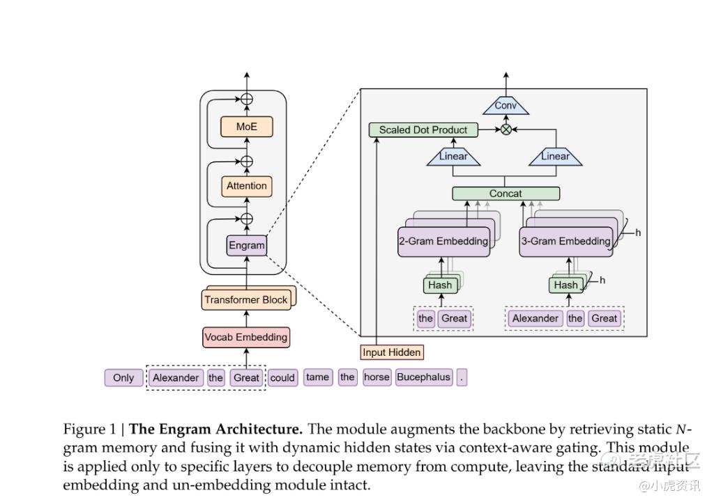 Engram模块:它是一个巨大的、可扩展的嵌入表(Embedding Table)。当模型读到“张仲景”或者“四大发明”这种固定搭配(N-gram)时,不需要动用大脑皮层去推理,直接通过哈希索引,在内存表中“查”出对应的向量。