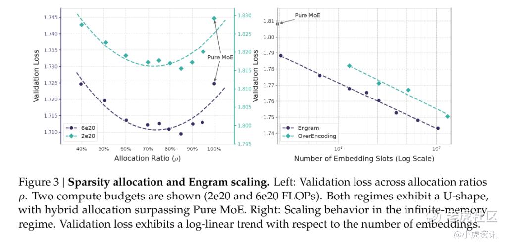 这是一个极具指导意义的发现:对于几百亿参数的大模型来说,单纯堆砌计算单元(MoE专家)已经是边际效应递减了,必须引入专门的静态记忆模块来实现“存算平衡”。