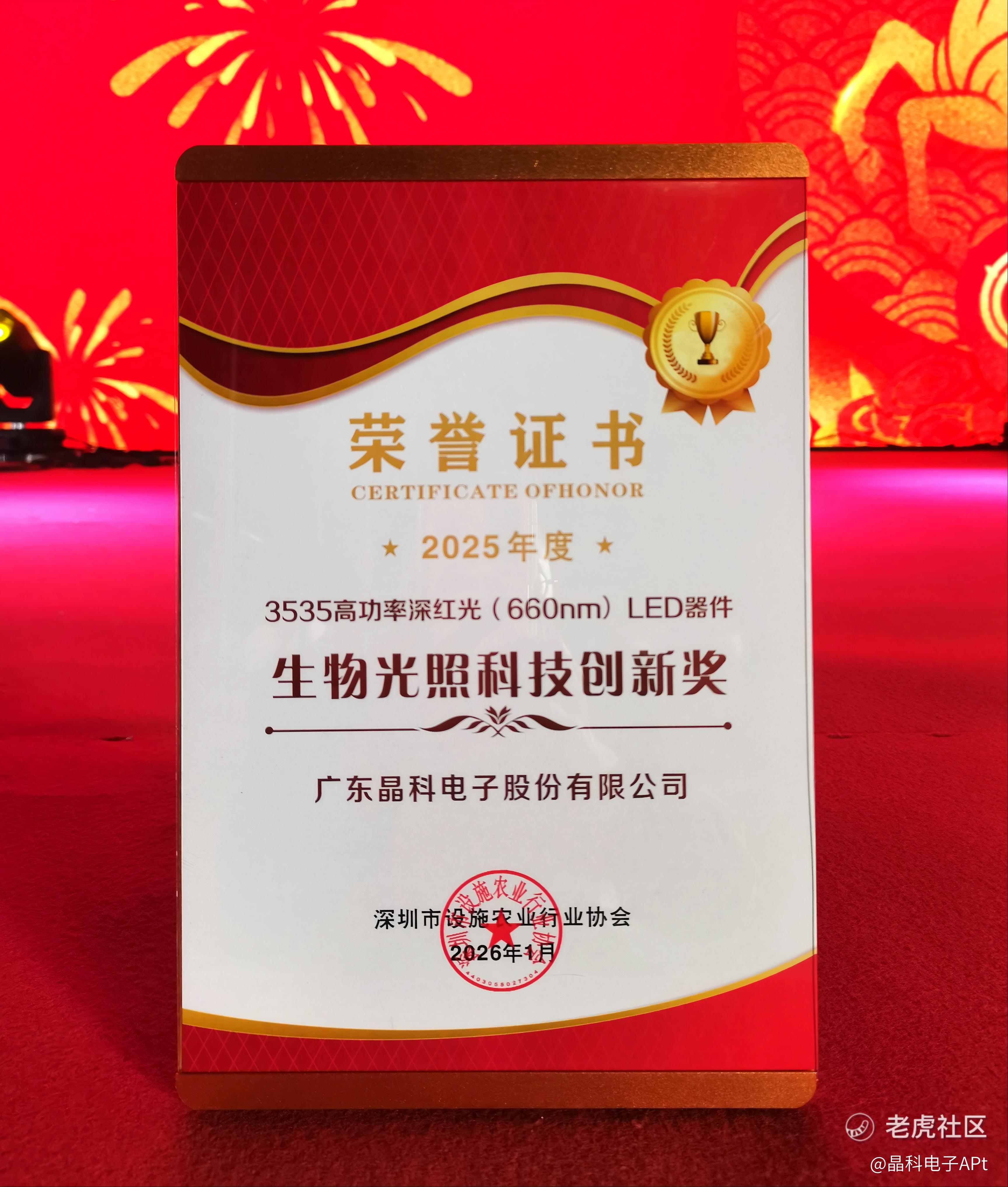 随着全球对粮食安全、绿色能源与可持续农业议题的愈受关注,植物照明技术正在成为支撑现代农业体系的关键力量。从植物工厂到高端温室,光照不仅是植物生长的基础条件,更逐渐演变为推动农业生产效率提升的重要变量。广东晶科电子股份有限公司(简称:晶科电子,股票代码:2551.HK)自主研发的 3535 高功率深红光(660nm)LED 器件,凭借领先的技术实力与稳定可靠的表现,近日荣获“2025年度生物光照科技创新奖”,该奖项充分肯定了晶科电子在智慧农业光照技术领域取得的突破性成果。
