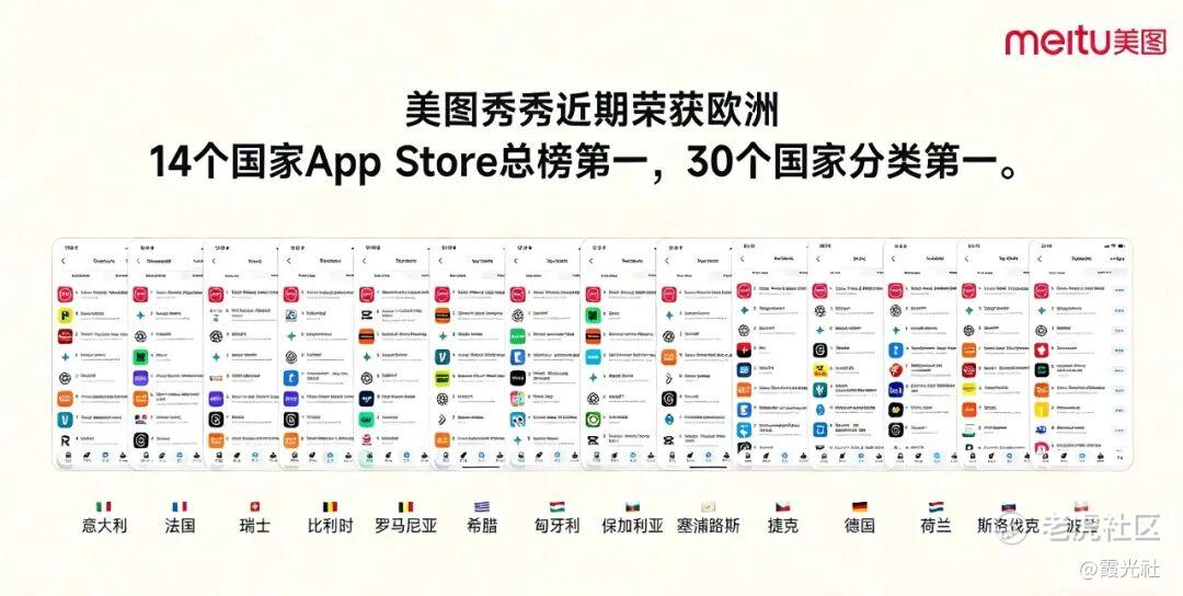 最典型的例子就是美图。截至2025年11月,BeautyCam(美图秀秀)凭借AI修图和互动玩法,在英国、挪威、瑞典等119个国家和地区登顶应用分类榜。仅10月期间,就在意大利、法国等14个国家获得App Store总榜第一。