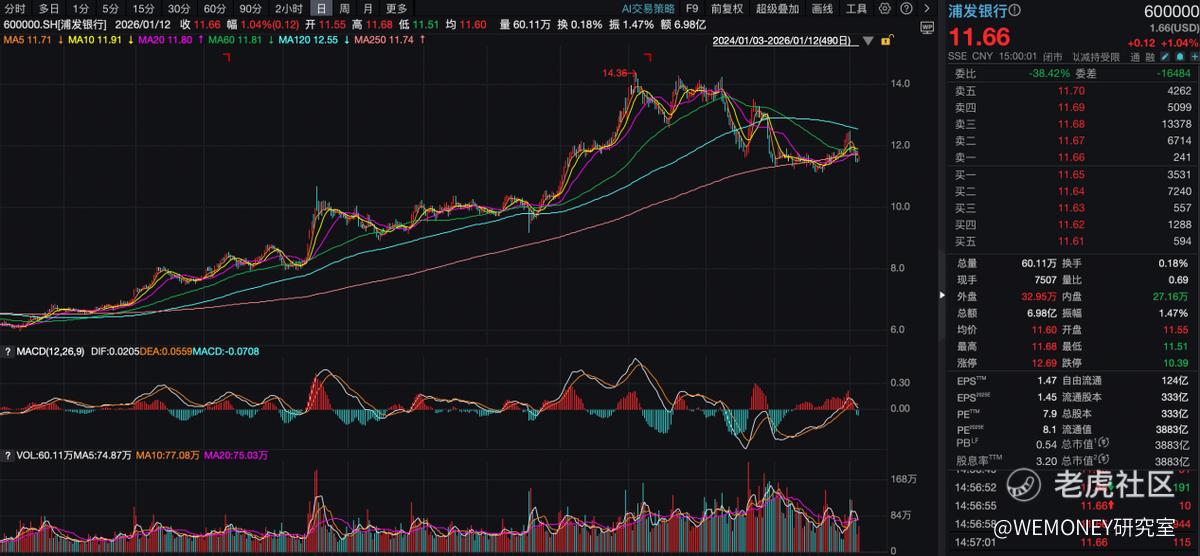 截至1月12日,浦发银行的股价报收于11.66元/股,较前期高点下挫18.8%,市值为3883亿元。