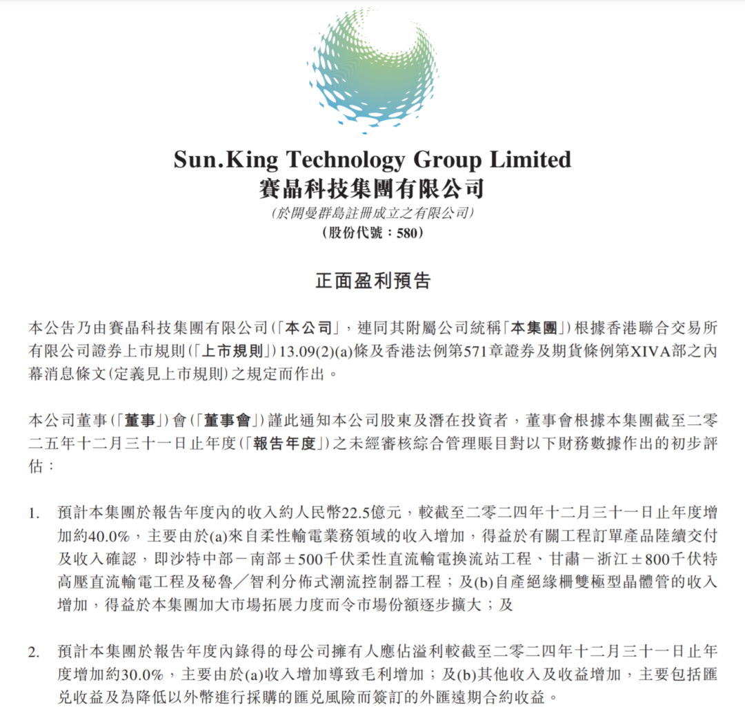 赛晶科技,发布2025年度业绩《正面盈利预告》