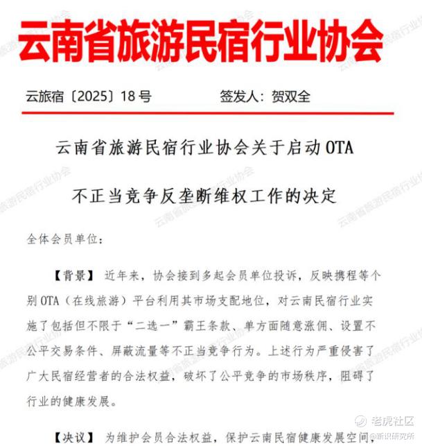 此次立案调查并非偶然,而是行业矛盾长期积累的结果。2025年12月,云南省旅游民宿行业协会发布维权公告,代表7000家会员单位对携程等在线旅游平台的垄断行为“宣战”。公告指出,协会近年来接到大量会员投诉,反映携程等OTA平台利用市场支配地位,实施“二选一”霸王条款、单方面随意涨佣、设置不公平交易条件、屏蔽流量等不正当竞争行为,严重侵害了民宿经营者合法权益,破坏了公平竞争的市场秩序,阻碍了行业健康发展。为维护会员权益,该协会已聘请专项律师团队征集证据,拟向市场监管部门提起集体投诉,并保留反垄断诉讼权利。