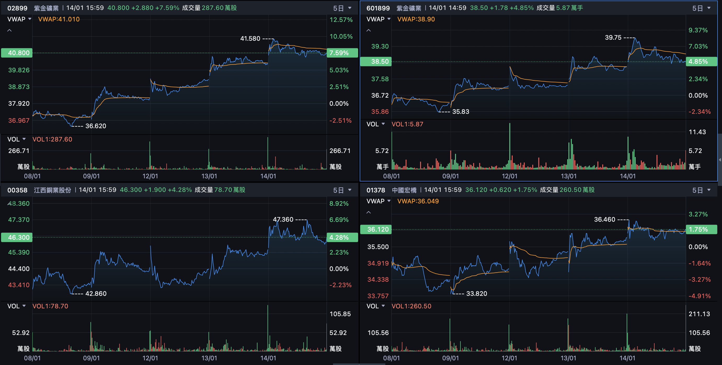 紫金矿业 $紫金矿业(02899)$ 1月14日收40.80港元,涨7.59%(+2.88港元),成交量1.287亿股。