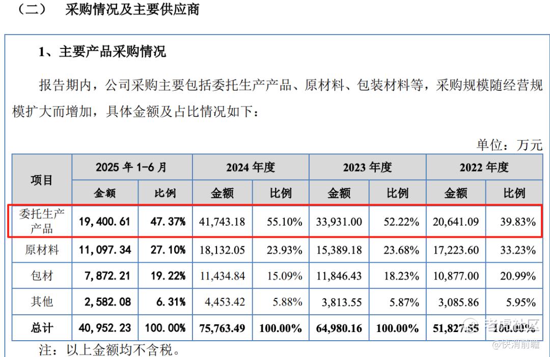 招股书数据显示,英氏控股对外委托生产的依赖度一直较高:按采购金额计,委托生产产品占比由2022年的39.83%上升至2024年的55.10%。虽然后因湖南浏阳自建生产基地投产,2025年上半年委托生产占比回落至47.37%,但总体而言近半产品仍由代工厂生产。