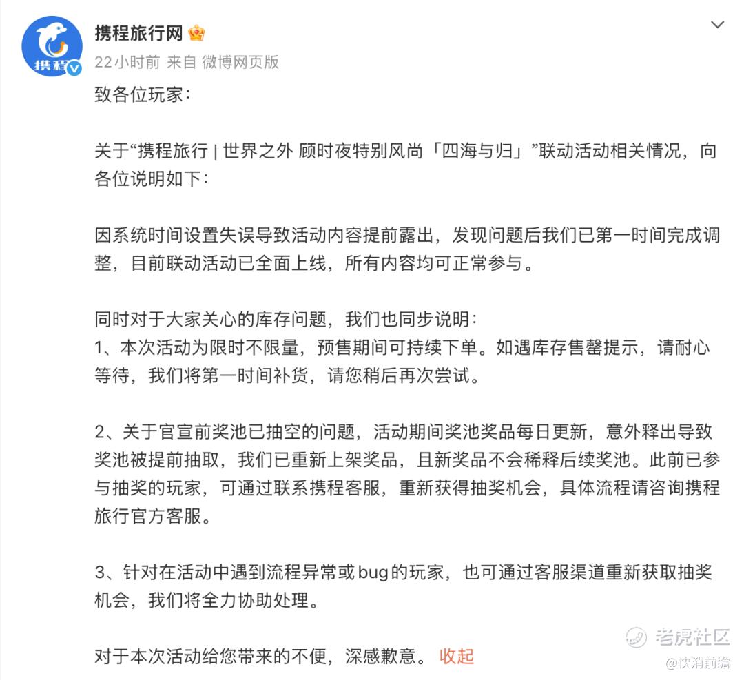 原来,携程与一款热门IP《世界之外》的联动活动本应在官宣后开启,但由于系统时间设置错误,活动内容意外提前上线,导致部分用户提前参与了抽奖并将奖池“抽空”。这一乌龙引发玩家不满,认为活动还未官宣奖品就被抢光,质疑活动公平性。