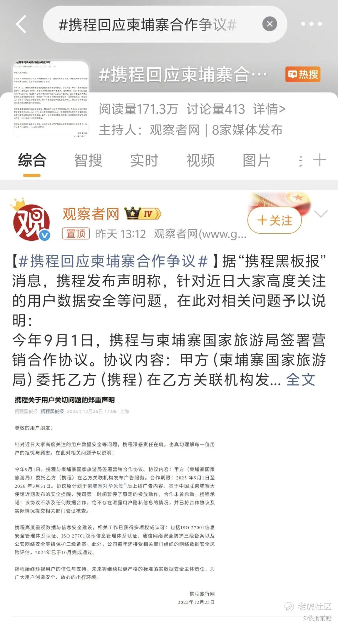 面对汹涌的舆论压力,携程直到12月25日当天才紧急发声辟谣。携程在声明中承认已注意到用户对数据安全的高度关注,并表示合作协议未曾启动:基于使馆安全提醒,原定的柬埔寨广告投放已第一时间叫停,协议中也不涉及任何数据合作,绝不存在泄露用户隐私信息的情况。公司称已将合作协议及实际情况提交相关部门核查,并强调携程非常重视数据和信息安全,已通过多项权威安全认证,每年也接受监管部门的数据安全评估等。