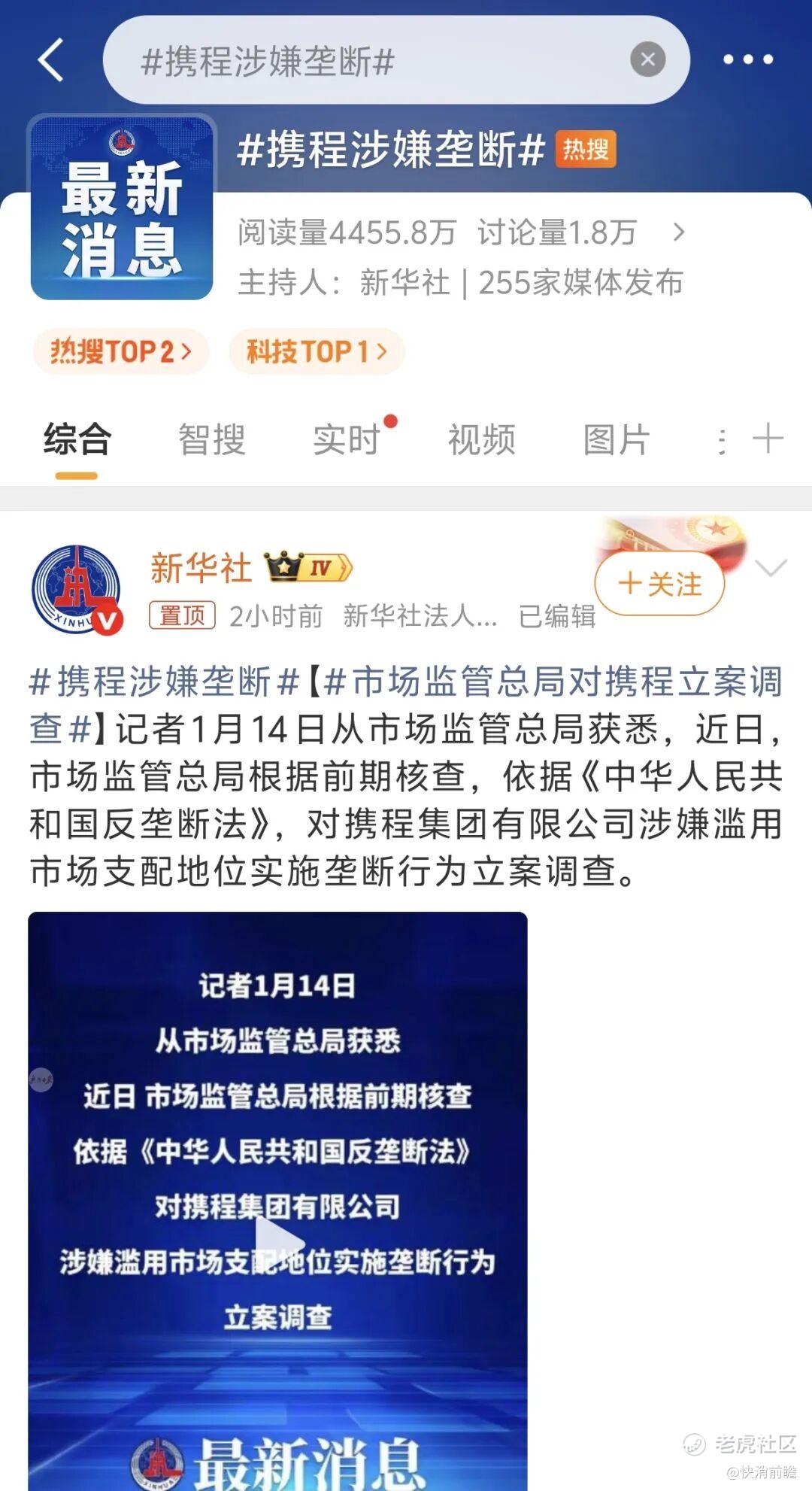 热搜背后,是一则”重磅“的监管信息:近日,国家市场监管总局根据前期核查,依据《反垄断法》,对携程集团有限公司涉嫌滥用市场支配地位实施垄断行为立案调查。