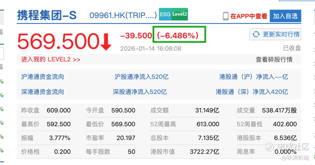 监管“落槌”也迅速传导至资本市场:携程港股当日尾盘一度跳水超9%,最终收跌约6.49%。